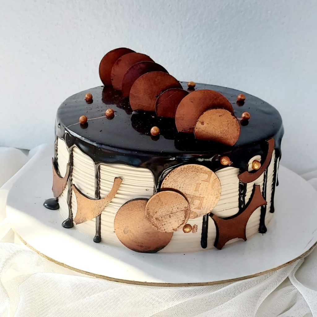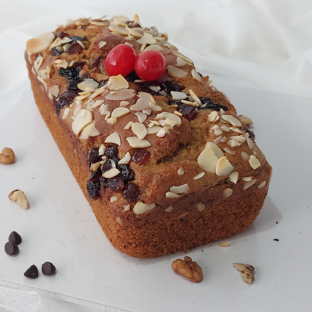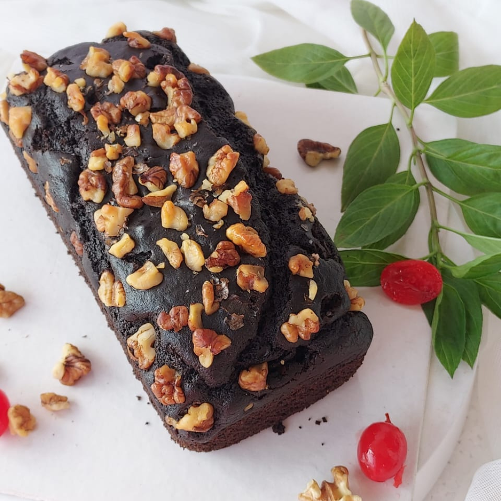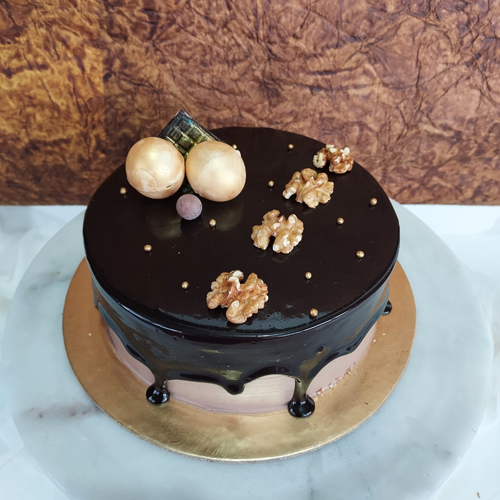 For all those coffee fans! Soft, moist and light sponge, flavoured with peaberry coffee, sandwiched with smooth whipped cream, topped with chocolate ganache and chopped walnuts. Egg free, no preservatives.