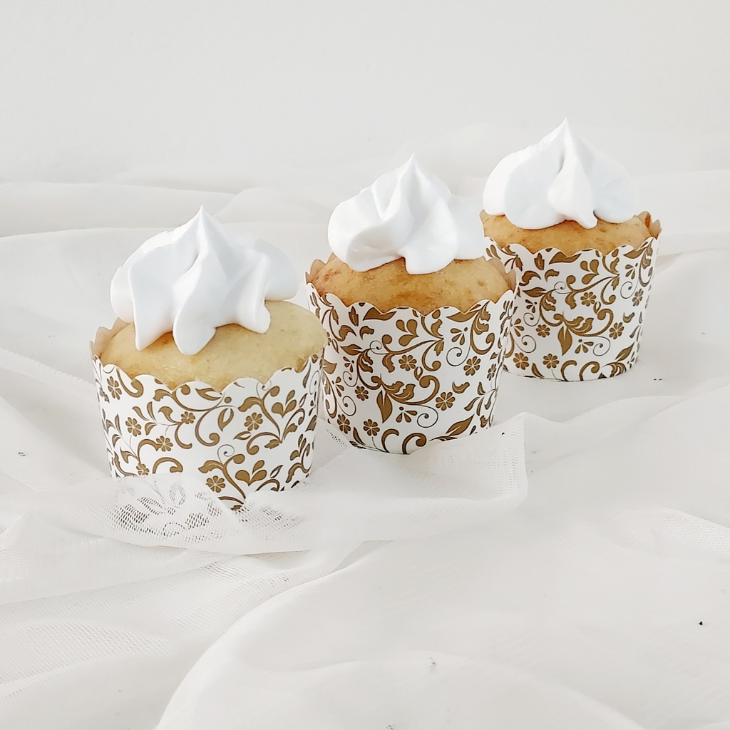 These cup cakes are delicate, light and moist, not too sweet and have a picturesque dome for dressing them up with a mound of buttercream.